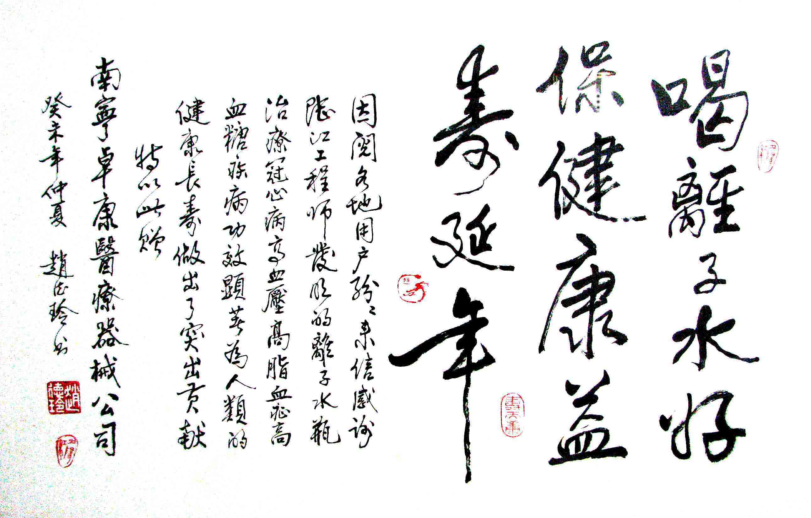 ---本品處理水用核磁共振測定值為55.82Hz(赫茲),為富含4-6個水分子小簇團的微小分子團水,可與世界各地長壽村水媲美。本品曾經三家省級醫院做臨床觀察,經北京和廣西醫學專家鑒定,22年來對以上病癥承諾療效,大量原發性高血壓患者飲用4至6個月內停藥,血壓正常穩定,癥狀消除,逐漸逆轉至消除動脈粥樣硬化;冠心病患者在3至5個月內逐漸減輕至消除心痛胸悶,一年左右痊愈,心腦電圖正常。這是根據中國基礎醫學研究成果和生命科學原理轉化為醫學應用的杰出成果,使人從細胞到器官發展至全身健康。2型糖尿病患者使用3-10月內痊愈。中風后遺癥患者7-10個月改善至消除肢體和語言障礙。用戶最新報告:尿毒癥患者飲用兩個月,指標已經大為改善,適合腎衰和透析者使用。以上均為史無前例的轉化醫學應用,產品壽命30年,不換芯。